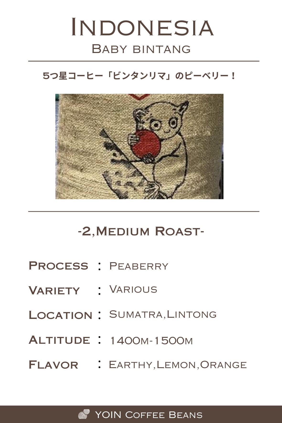 インドネシア ベイビービンタンの魅力は、その豊かな風味とシトラスのような酸味にあります。ほのかな甘さが広がり、一口ごとに心地よさが蘇ります!日常のコーヒータイムを特別なものに変えてくれる、至福の一杯です。
